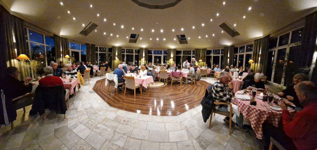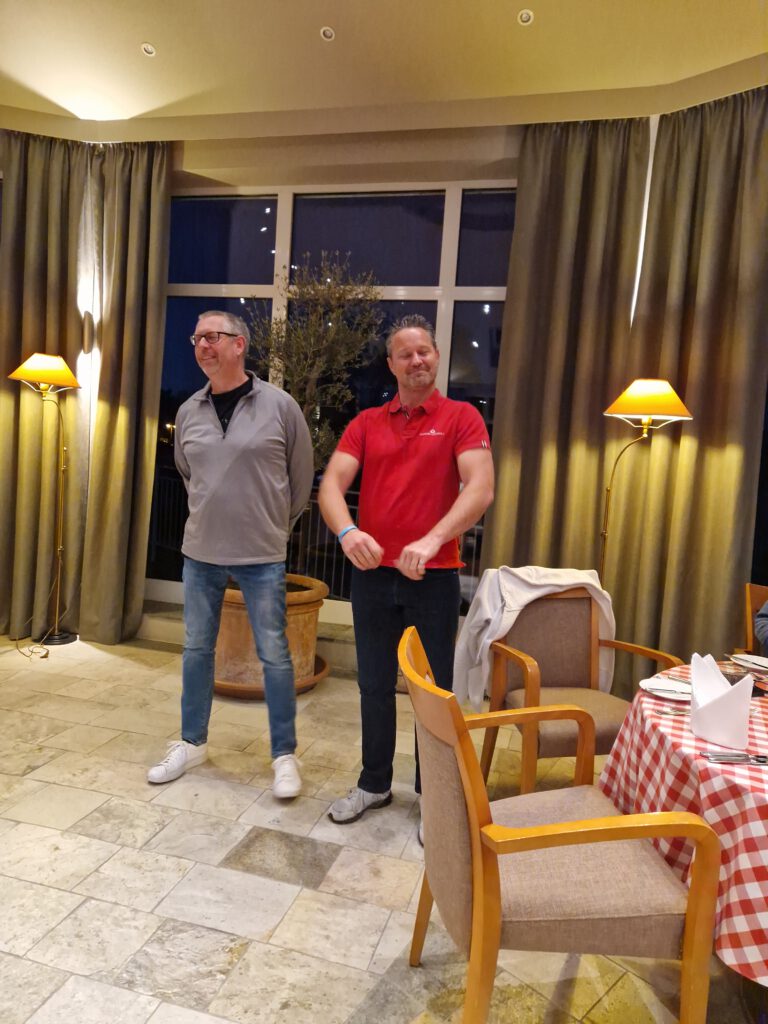 Leider hatte so manch einer Pech und musste doch länger als normal auf sein Essen warten, die Servicekräfte waren aber „stets bemüht“. Im Anschluss daran gab es die Siegerehrung für den ersten Tag. In der Bruttowertung konnte sich mit 47 Bruttopunkten (11 unter Par) das Team Dirk, Thomas, Curosch und Frank souverän durchsetzen.