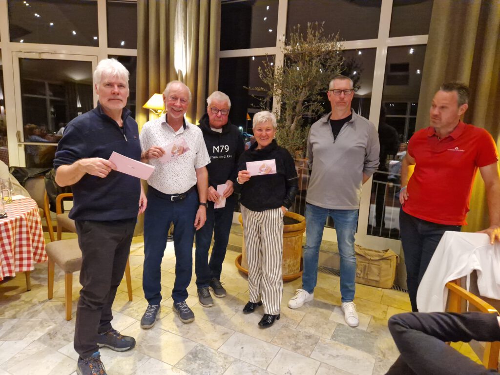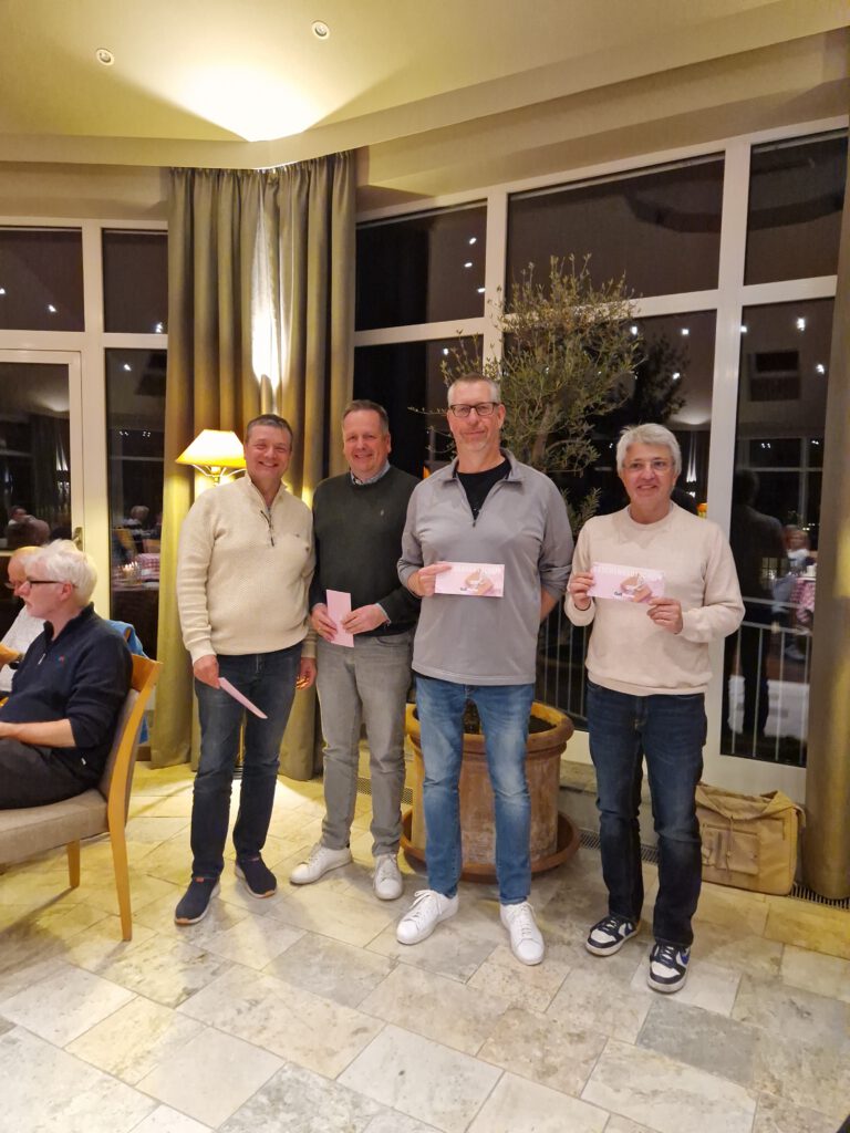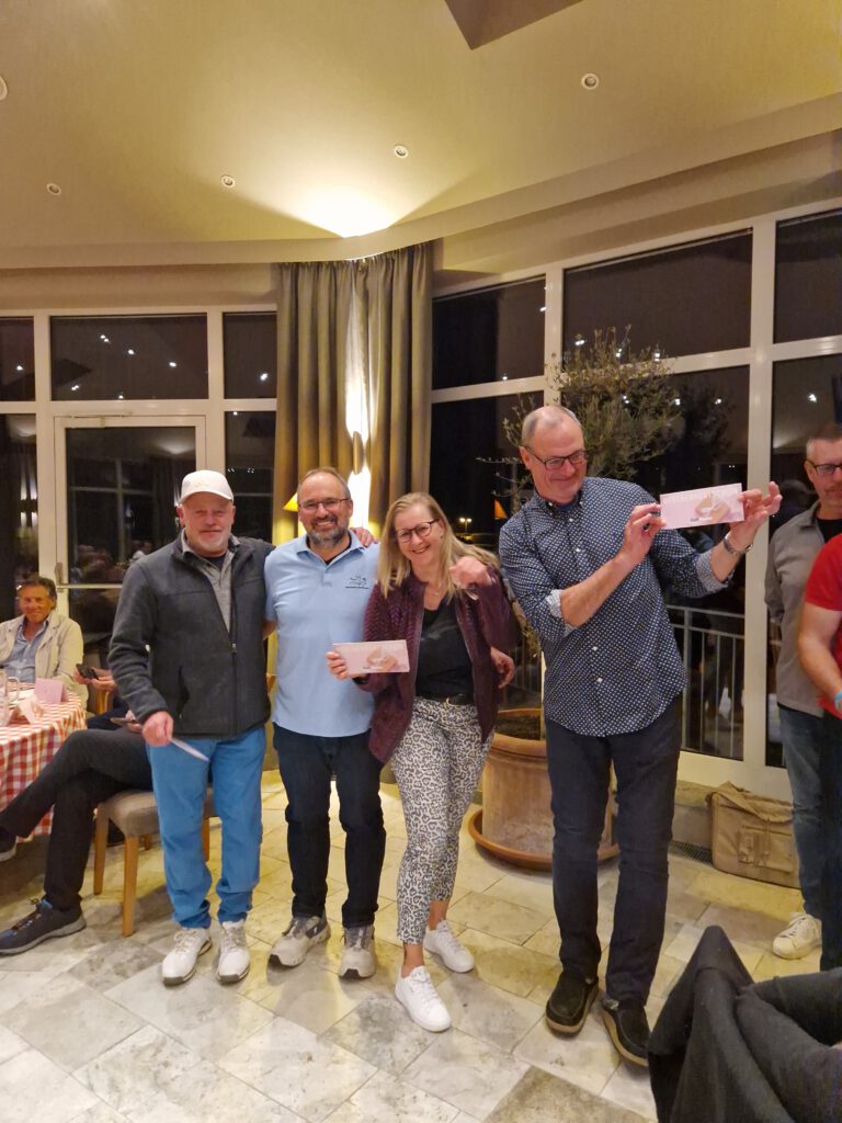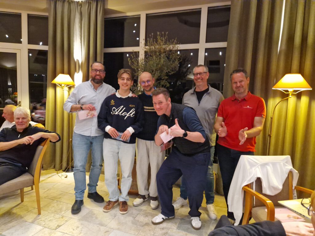 Die Teams wurden noch am Abend einfach Hoch-Mittel-Tief von PC-Caddie gesetzt, so dass auch mal ganz neue Teams entstanden. Auch wenn der Wettbewerb hier ebenso zweitrangig war, so gab es dann doch Sieger und Gutscheinempfänger. In der Nettoklasse B gewannen mit 64 Punkten Gersi, Dani, Jörg und Christian H.
